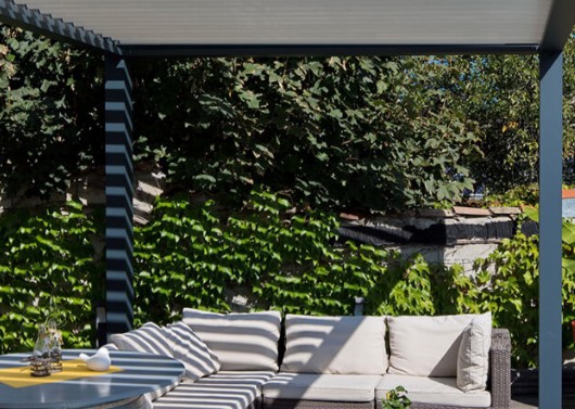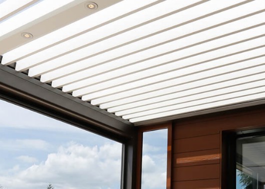 A cobertura do pátio bioclimático da BIO 180: experimente cores e imagine um novo modo de vida. Com 6,1 metros de altura, alimenta a sua imaginação para o layout do seu espaço ao ar livre, envolto em calor e uma sensação de bem-estar. Devido às suas ripas giratórias de até 175 °, segue com precisão a curva do sol, oferecendo-lhe a melhor ventilação natural da Biossun. Não precisa se preocupar com o clima enquanto desfruta de um pátio com ventilação ideal.
