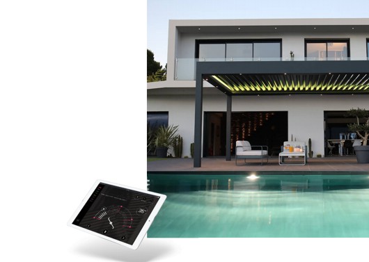Esqueça tudo que você costumava conhecer. Hoje é um novo dia. Você está finalmente livre. Livre para criar a sua própria interação de sombras e luz, girando cada slat de sua cobertura de pátio bioclimático individualmente. Livre para recolher as ripas completamente para abrir caminho para o sol ou as estrelas. Livre para domesticar o sol a cada momento do dia, controlando-o através do seu smartphone ou tablet.